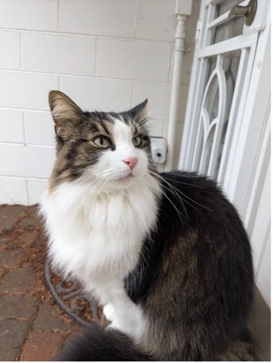 Mr. Man is notorious in Buckman for sneaking into homes and sleeping in strangers’ beds (see our December 2025 issue). He believes every person is his friend, every bowl a food source, and every other cat a fan of his work. Territorial blindness? Or sheer audacity? Yes!