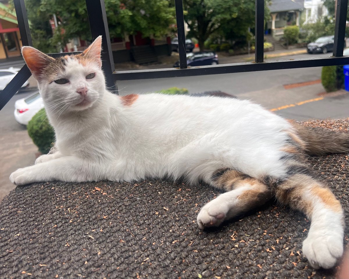 Noodle (Salmon St.) has never heard of private property. If him fit, him sit. He believes he has a right to lounge on anything outside. He will sit on your car and hiss at you for trying to drive his spot away. He believes he is king and has dominion over his corner of Salmon Street.