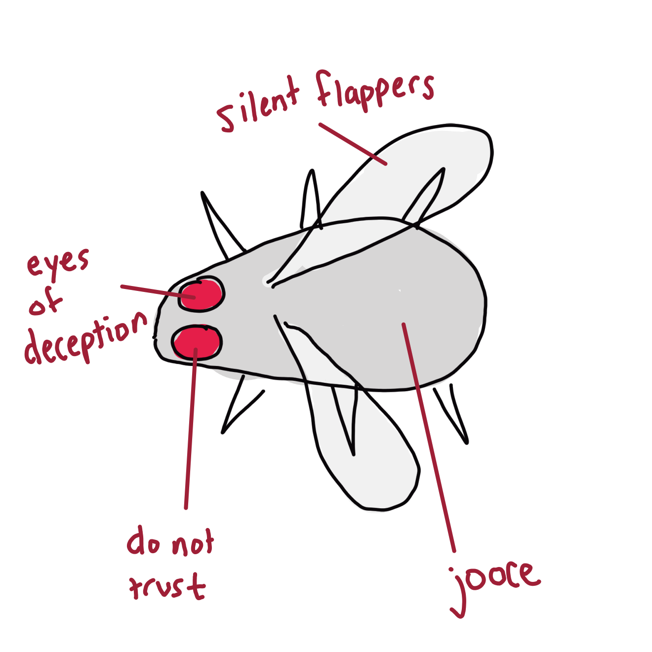 Frootflies do not make any sound. They are smol, silent sneakers, but they have the same amount of jooce as much bigger prey, say, that squirrel I hate. If frootflies eat froots, does that mean their jooce is froot jooce? The scientific answer is no. Once froot jooce enters the belly, it gets turned into bug jooce—some call this magic, but we call this science. We spoke to an expert (it’s me but I put on a white coat) about frootflies and they said that “those little shits will drive you freaking crazy, but the pursuit is worth the prize.” We (I take coat off) agree. I love eating them and sometimes throwing them up too! Here is a diagram of the froot fly.